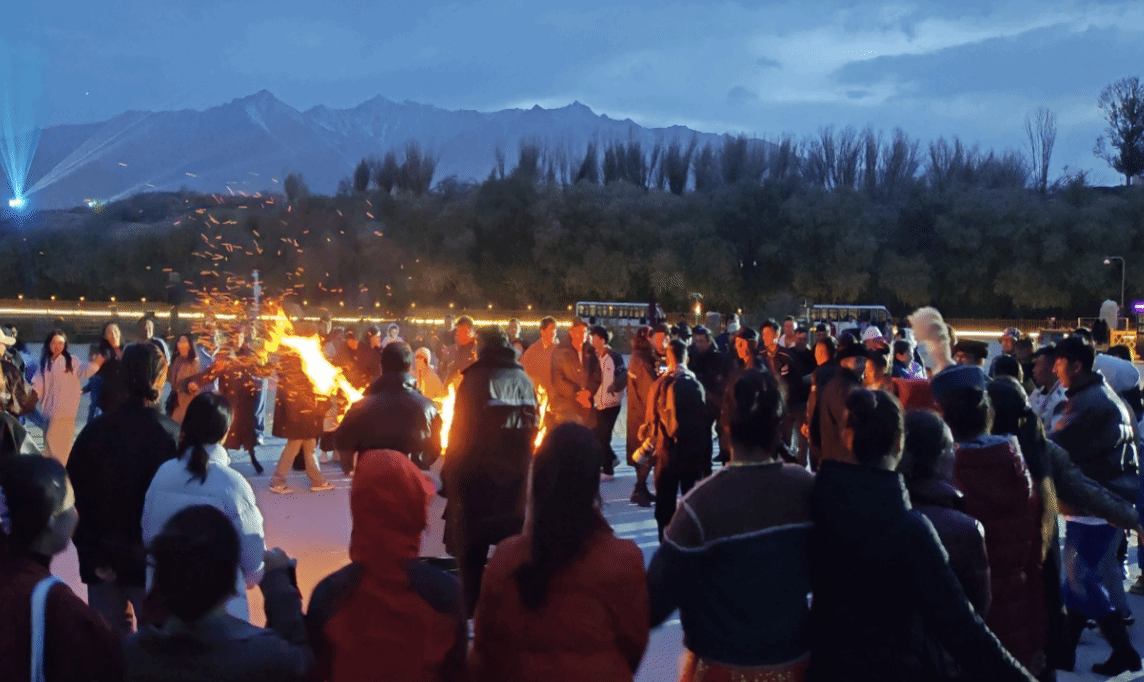 穿过历史烟云,师生们步入与石头城遥相呼应的金草滩湿地公园。讲解员结合湿地的生态展板,向大家揭秘着高原的“绿肺”如何滋养这座古城的文明。金草滩现场篝火晚会上,同学们向当地村民和游客展示了精心准备的节目,不同民族的舞蹈、音乐节目轮番上演,现场舞动的彩裙与跃动的火苗交相辉映,将“文化认同是最深层次的认同”理念深深融入各族群众心中。