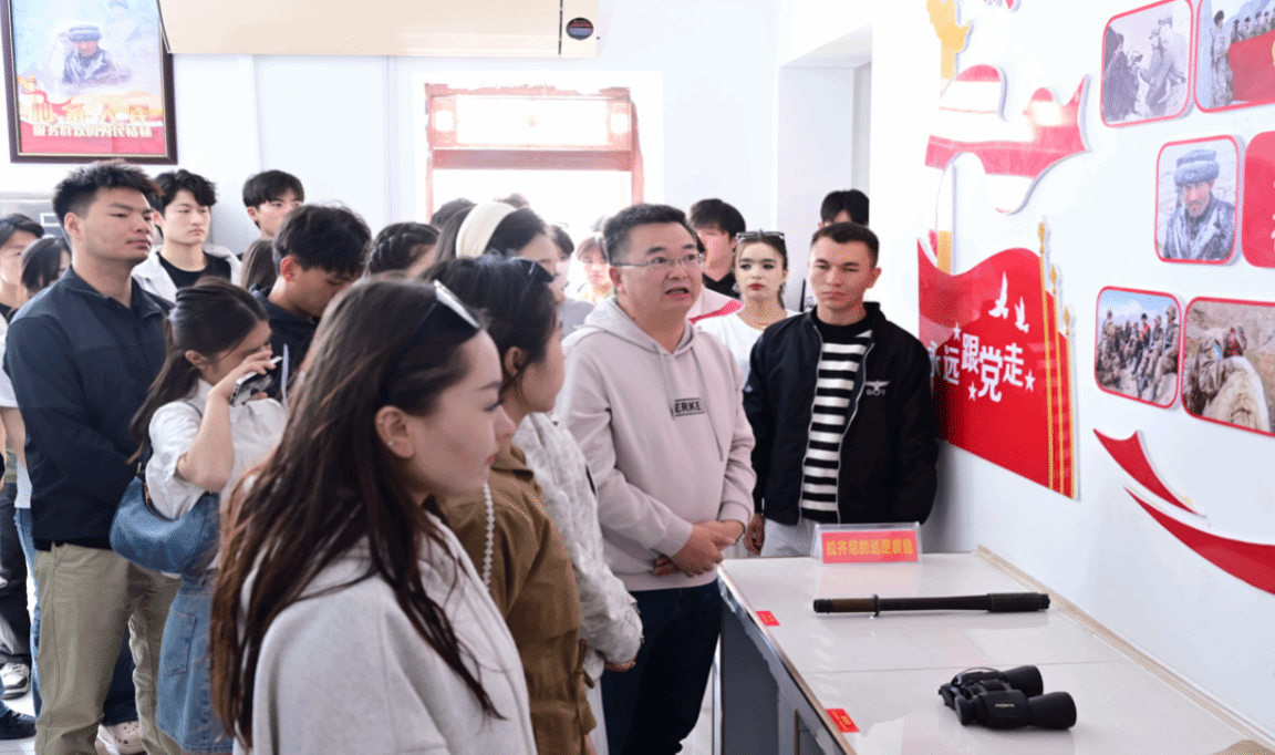 参观拉齐尼执勤工作站和提孜那甫守边戍边爱国教育馆期间,师生代表近距离观看了馆内陈列的图片资料和拉齐尼·巴依卡一家三代爱国守边的事迹。任飞书记结合拉齐尼·巴依卡在喀什大学舍身勇救落水儿童的英雄事迹,现场为大家上了一场别开生面的党课,将“时代楷模”精神具象化为“帕米尔高原缺氧而不缺精神”的鲜活教材,当《我和我的祖国》的旋律从烈士雕像前升起时,塔吉克民族舞蹈与合唱交织成感人画卷。参观结束后同学们纷纷表示:争做英雄才会产生英雄,崇尚英雄才会英雄辈出,向英雄致敬。