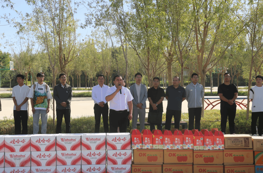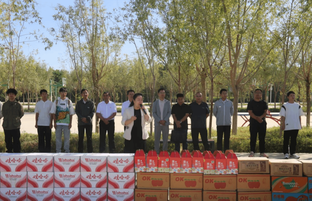 领导们的话语温暖而有力,赢得了新生们阵阵热烈的掌声。随后,慰问物资发放环节正式开始。老师们和学生干部代表们亲手将矿泉水、水果、月饼等物资送到每一位新生手中,同时关切地询问大家的训练情况和身体感受。新生们接过物资,脸上洋溢着灿烂的笑容,眼神中充满了坚定。