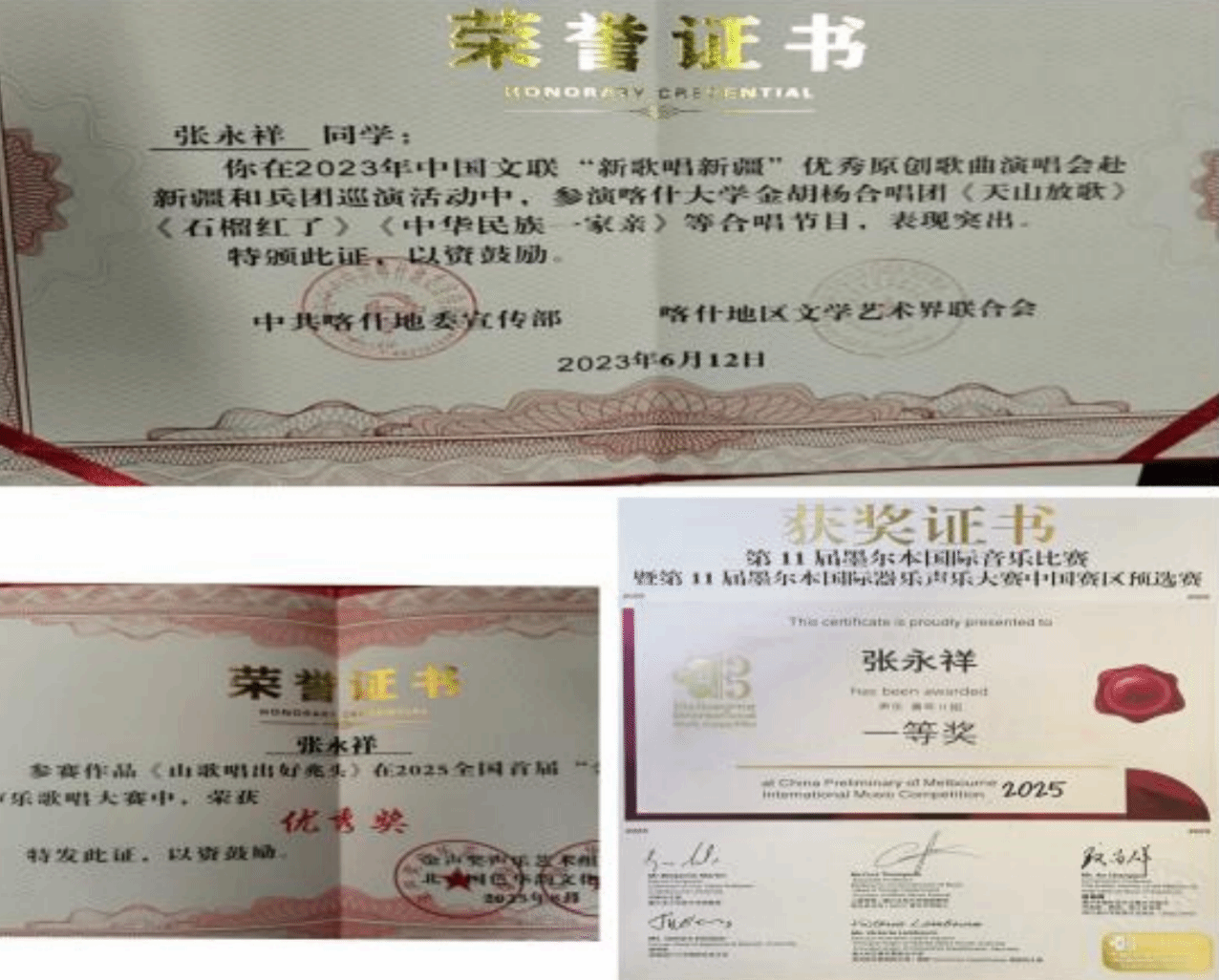 从校园的“心理情景剧大赛”、“迎新晚会”,到地区级的“红石榴青年歌手大赛”,再走向省级、国家级的舞台——第十一届墨尔本国际声乐大赛、香港文化节国际声乐大赛、“美育杯”……每一次站上台,灯光洒落的刹那,都不只是表演,而是一场与自我的深度对话。获奖证书上“一等奖”的字样固然闪亮,但更让我珍视的,是那个在后台紧张调整呼吸的自己,是每一次演唱时与作品灵魂相拥的瞬间,是赛后聆听评委点评时如饥似渴的专注。我渐渐懂得:比赛,不是为了击败谁,而是为了一次又一次,超越昨天的我。
