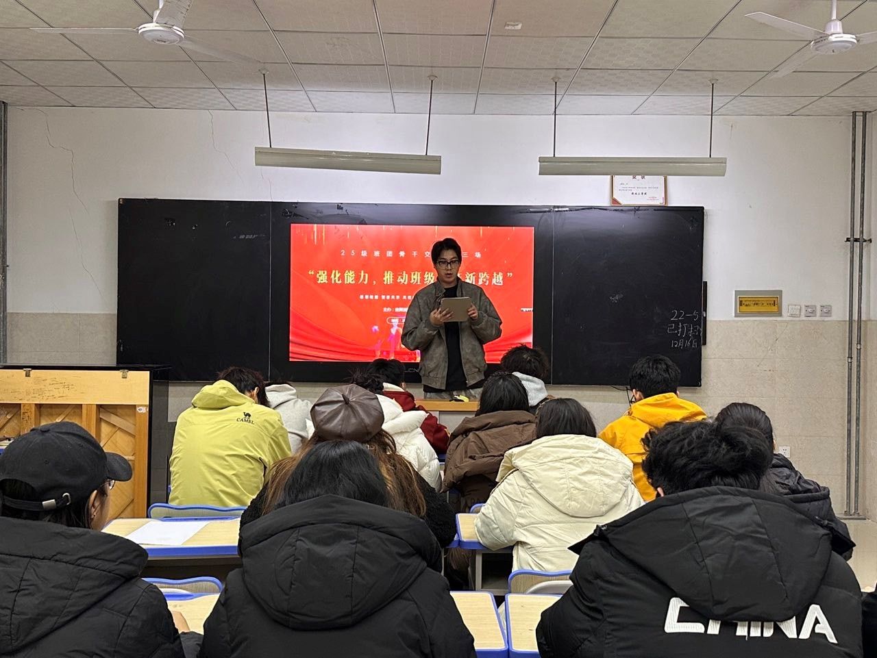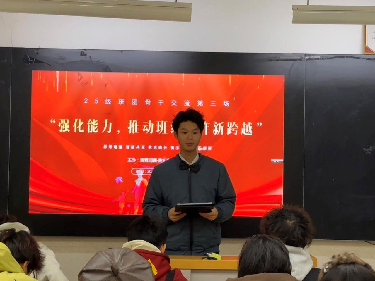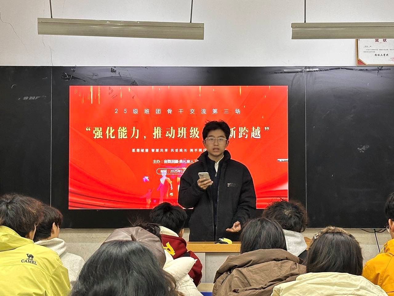 为深入贯彻落实文化润疆工程,创新美育与思政教育深度融合的实践路径,同时持续赋能新生骨干队伍成长,我院"乐舞润疆。典礼育人工作室"于12月17日在B208教室成功举办首场主题育人活动。本次活动与"25级班团骨干能力提升计划"第三场培训深度融合,以"交流:在聆听与对话中汲取成长力量"为核心主题,特别邀请学院官微品牌栏目"音舞先锋"专栏中涌现出的四位优秀学子代表李强坤,王辰宇,张永祥,陈心怡担任主讲嘉宾,分享他们的成长心路与实践智慧。工作室主持人莫尼拉·木萨,郝东及2025级全体班长,团支书,学习委员齐聚一堂,共同参与了这场思想与经验交汇的盛宴。