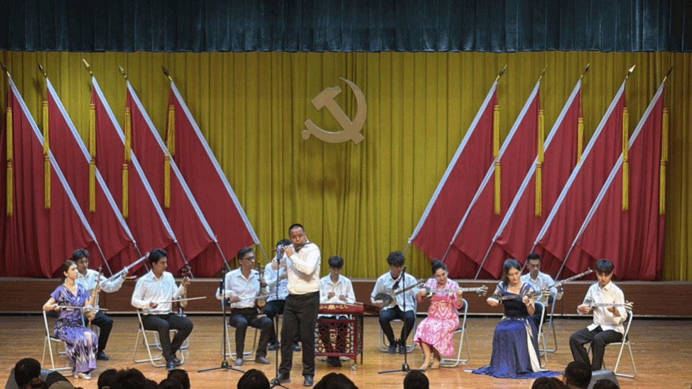 演出在喀什大学金胡杨乐团悠扬的民族器乐合奏《春天》中正式开始,旋律如春风拂过戈壁,传递出无限的生机与希望。随后,阿依努尔·热夏提老师与乐团带来的维吾尔族经典民歌《牡丹汗》,以其浓郁深情的韵味,瞬间将观众带入新疆广袤土地的深厚情感记忆之中。