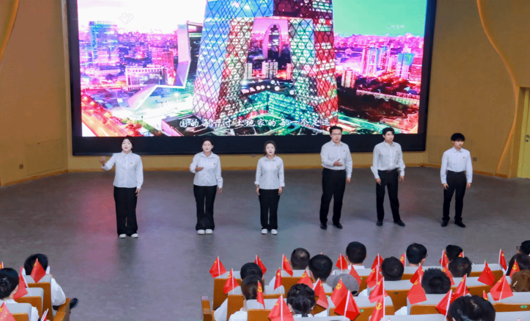 音乐与舞蹈学院师生党员、积极分子代表领唱红色爱国歌曲《国家》,全体参会人员共同合唱。“家是最小国,国是千万家”的动人旋律在剧场回荡,歌声中饱含着边疆师生对祖国、对新疆的深情眷恋,更传递出“守好边疆、建设边疆”的使命担当,以艺术之美凝聚起边疆儿女的家国情怀。
