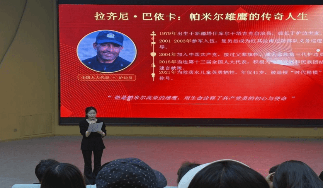 活动第一环节,全体党员师生齐聚石榴剧场舞蹈厅,共同聆听拉齐尼·巴依卡同志的英雄事迹宣讲。宣讲现场,一段段饱含深情的讲述,一幅幅感人至深的画面,全面展现了英雄的一生。拉齐尼·巴依卡1979年出生于新疆塔什库尔干塔吉克自治县的护边世家,2004年加入中国共产党,是家族第三代护边员。他扎根帕米尔高原,数十年如一日骑着牦牛义务巡边,不畏严寒、不惧艰险,用脚步丈量祖国边境线,用坚守守护边疆安宁;2018年当选第十三届全国人大代表后,他始终心系边疆发展、心系民族团结,积极建言献策,全力为边疆群众发声;2021年,面对落水儿童的危急时刻,他义无反顾跳入冰冷湖水,用生命托举生命,年仅41岁英勇牺牲,后被追授“时代楷模”称号。“为国戍边,义不容辞”,他用一生践行共产党员的初心使命,现场师生无不被这份忠诚与担当深深震撼,热泪盈眶。