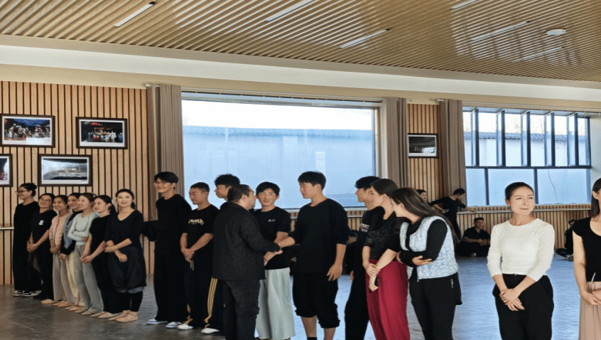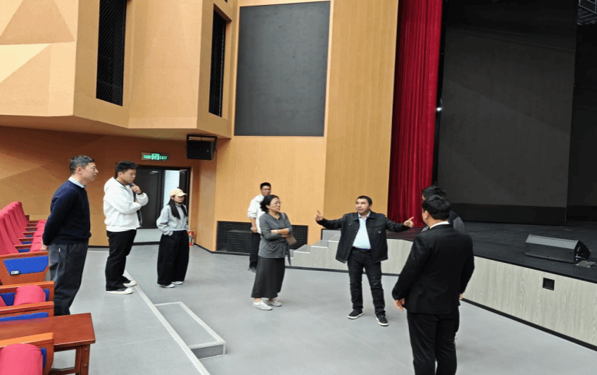 交流座谈结束后,艾书记一行实地参观了文工团专业舞台场地,详细了解演出排练、设施配备等情况。在学生训练场地,艾书记与正在实习的学生亲切交流,不仅送上慰问与关怀,还鼓励大家发扬“能吃苦、肯吃苦”的精神,珍惜实践机会提升专业能力,并明确表示“实习过程中有任何困难可随时联系”,让学生感受到学院的坚实后盾。活动最后,艾书记一行观看了学生彩排的舞蹈剧,对作品的编排创意与学生的表演状态给予肯定,并提出针对性指导意见。