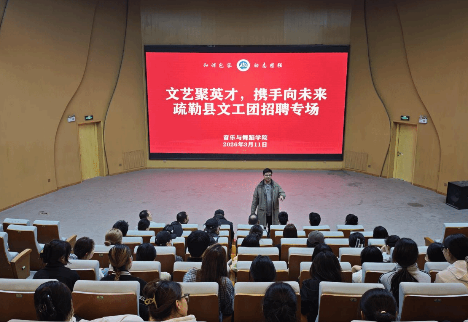 为落实毕业生就业工作部署,深化产教融合与校地合作,精准拓宽毕业生就业渠道,音乐与舞蹈学院于3月11日与疏勒县文工团联合举办专场人才招聘会。学院党委副书记、纪委书记艾山江·吾买尔、毕业班班主任、辅导员及80余名在校舞蹈表演专业毕业生参加本次招聘会。
